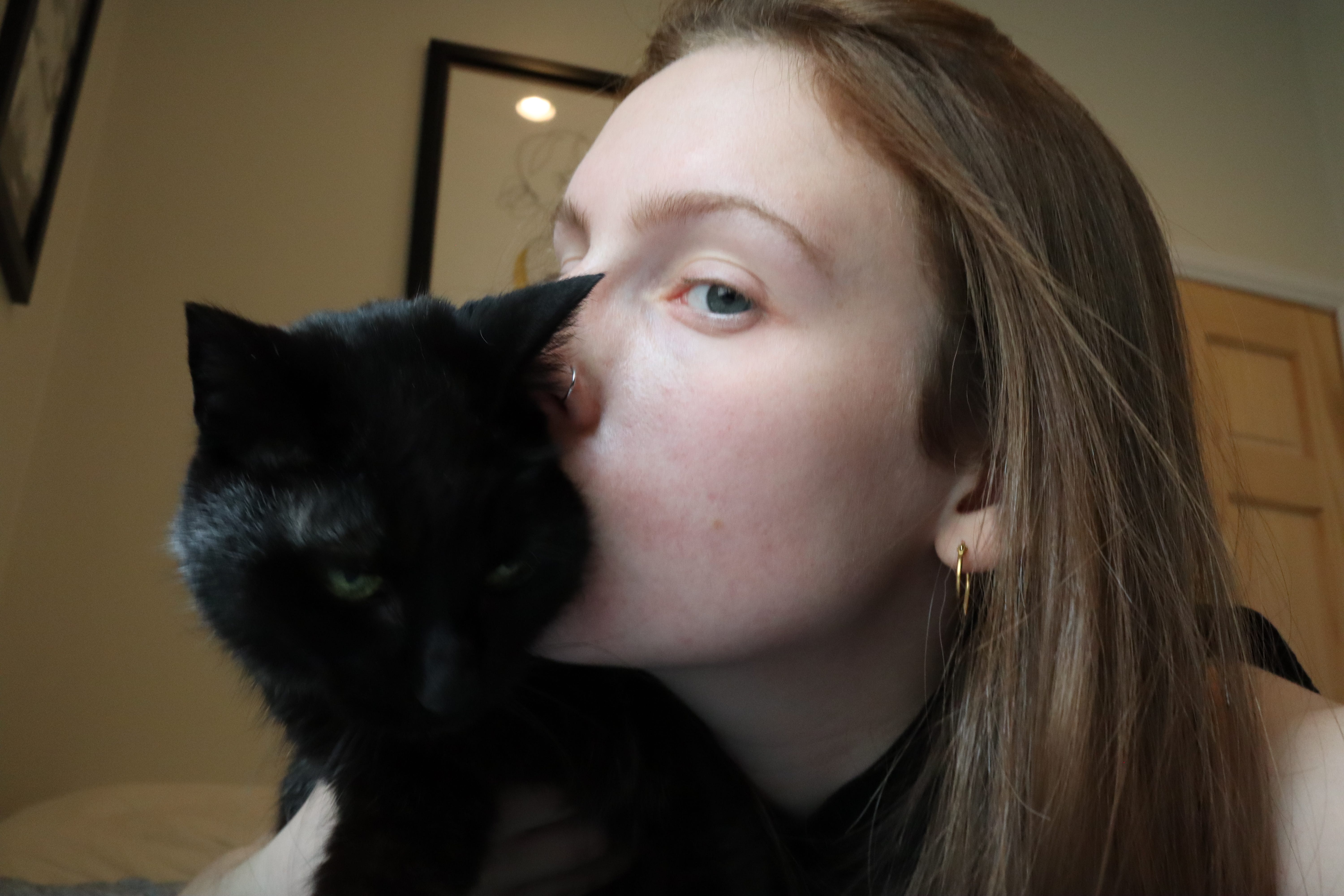 Eventually, Lucky ripped open my heart and hopped inside. It was known throughout the community (my house of four people) that she was mine. When I moved into the bedroom downstairs, she followed along and slept there almost every night. For years. And when I went to college and came home on breaks, she was back in my room. At that point, she was 15 or so, and Hector was beginning to show his age. But Lucky was still as lively as she was the day we were told she was a boy. I always imagined that if Hector and Lucky could speak, Hector would sound like Antonio Banderas (thanks to Puss in Boots) and Lucky sounded like Evanna Lynch (Luna Lovegood in the Harry Potter franchise). Her meow was as high-pitched, but when she was mad that she didn’t get our attention after, maybe two meows, it turned into Brendan Gleeson. That girl could scream, and it could be a very low scream. An impossible pitch to match, I’ll tell you that much.