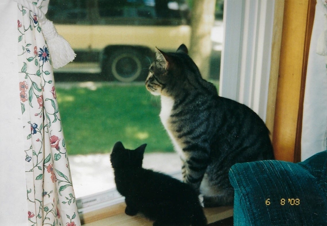 A few weeks after April 20, 2003, a sweet little black cat that the vet told us was a boy came into our lives and into our other kitten’s nightmares. My mom was the one who figured out she was a girl. My entire family disagrees with me, but to this day, I am 110% sure I named her Lucky. As a six-year-old, naming a black cat Lucky felt ingenious. Lucky and I didn’t connect right away. I used to shout for my parents to run into my room because the cats were chasing each other on the floor around my bed, and my brother and I thought that if we tried to step off my bed, our lives would be over before they even began. And just to give a better visual, when they were acting all homicidal and violent, this is who they were traumatizing:
